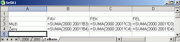 - Příklad:V listech jsou uložena data o počtech studentů na fakultách. Každý list představuje jeden rok. Cílem je vytvořit list, kde budou součty studentů za všechny roky. Tabulka (pokud si to chcete vyzkoušet, je ke stažení zde) vypadá následovně: