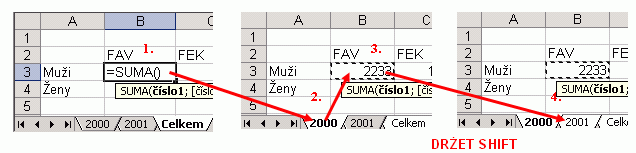 - Držet klávesu SHIFT a kliknout na poslední list součtu.