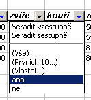 V tabulce označíme řádek s popisy jednotlivých sloupečků. Pak přes nabídku: Data -> Filtr -> Automatický filtr vygenerujeme filtr. Že se filtr vytvořil poznáme podle toho, že se záhlaví změní (každého názvu se objeví kostička se šipkou).