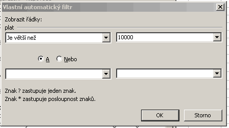 Trochu složitější bude situace pro sloupec plat. Kdybychom vybrali 10.000, filtr ukáže jen ty řádky, kde je plat 10.000 (což nechceme). Musíme vybrat (vlastní...), otevře se okno, kde vybereme je větší než a čásku 10.000.